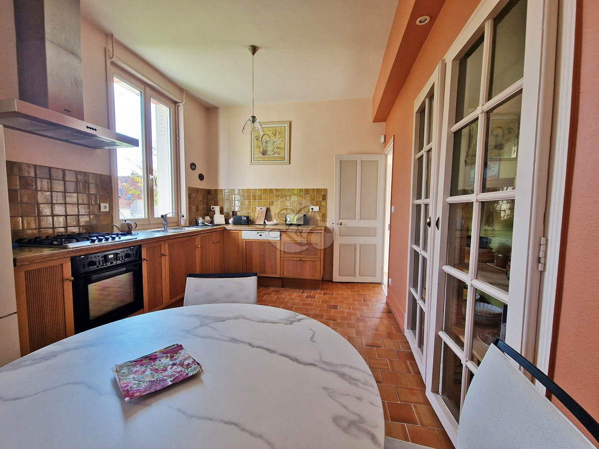 Cuisine aménagée d'éléments bas, équipée, carrelée, accès à la verrière, 16m² env
