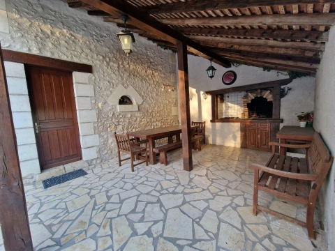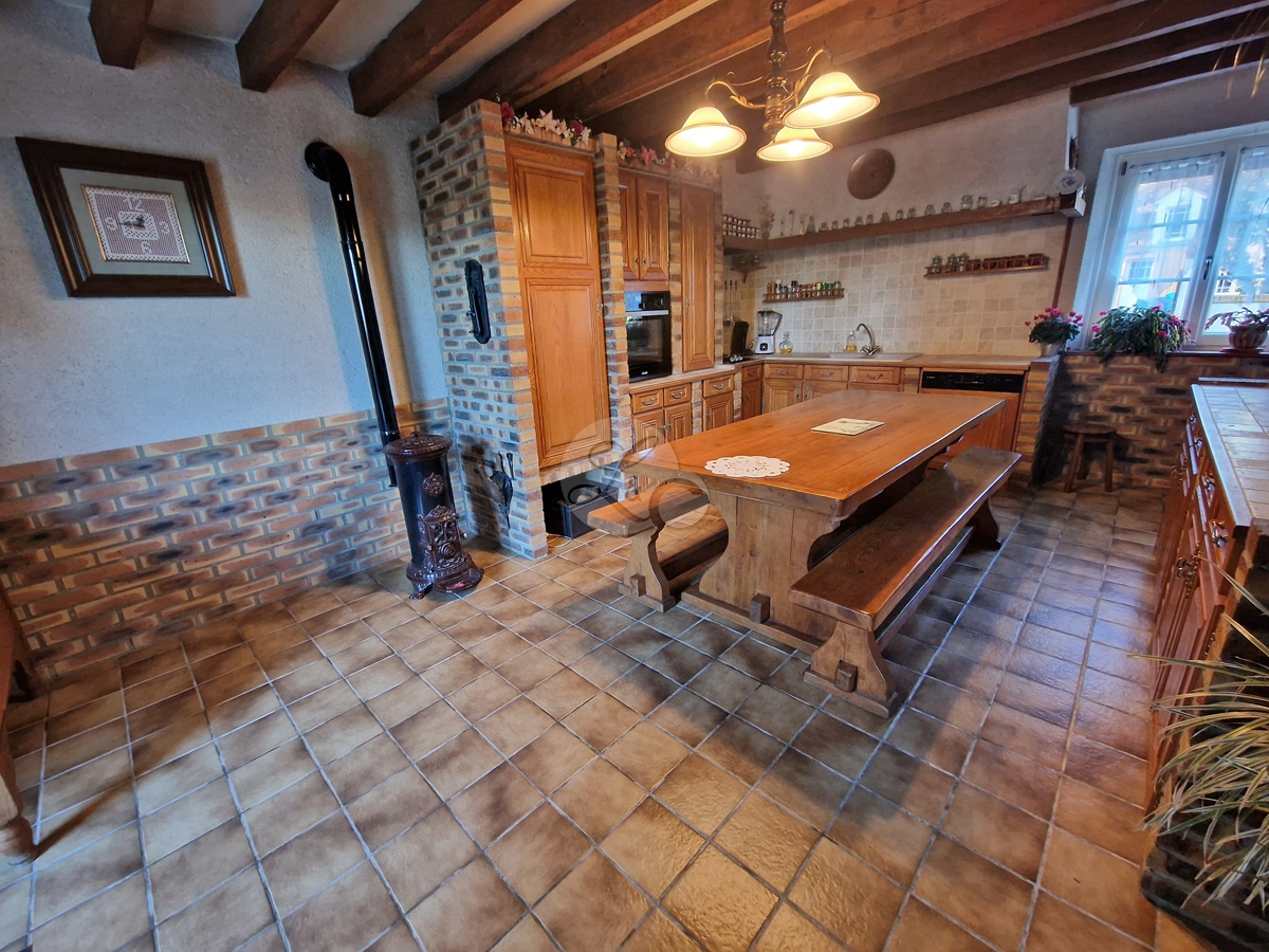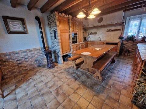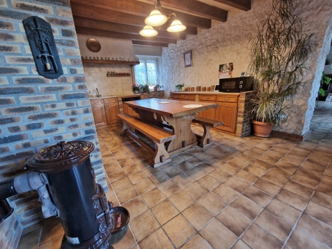 Au rez-de-chaussée, une cuisine aménagée et équipée ouvre directement sur une terrasse orientée sud-est. Le séjour, mis en valeur par ses poutres et pierres apparentes, bénéficie également d’un accès à l’extérieur. S’ajoutent des WC ainsi qu’une salle d’eau.