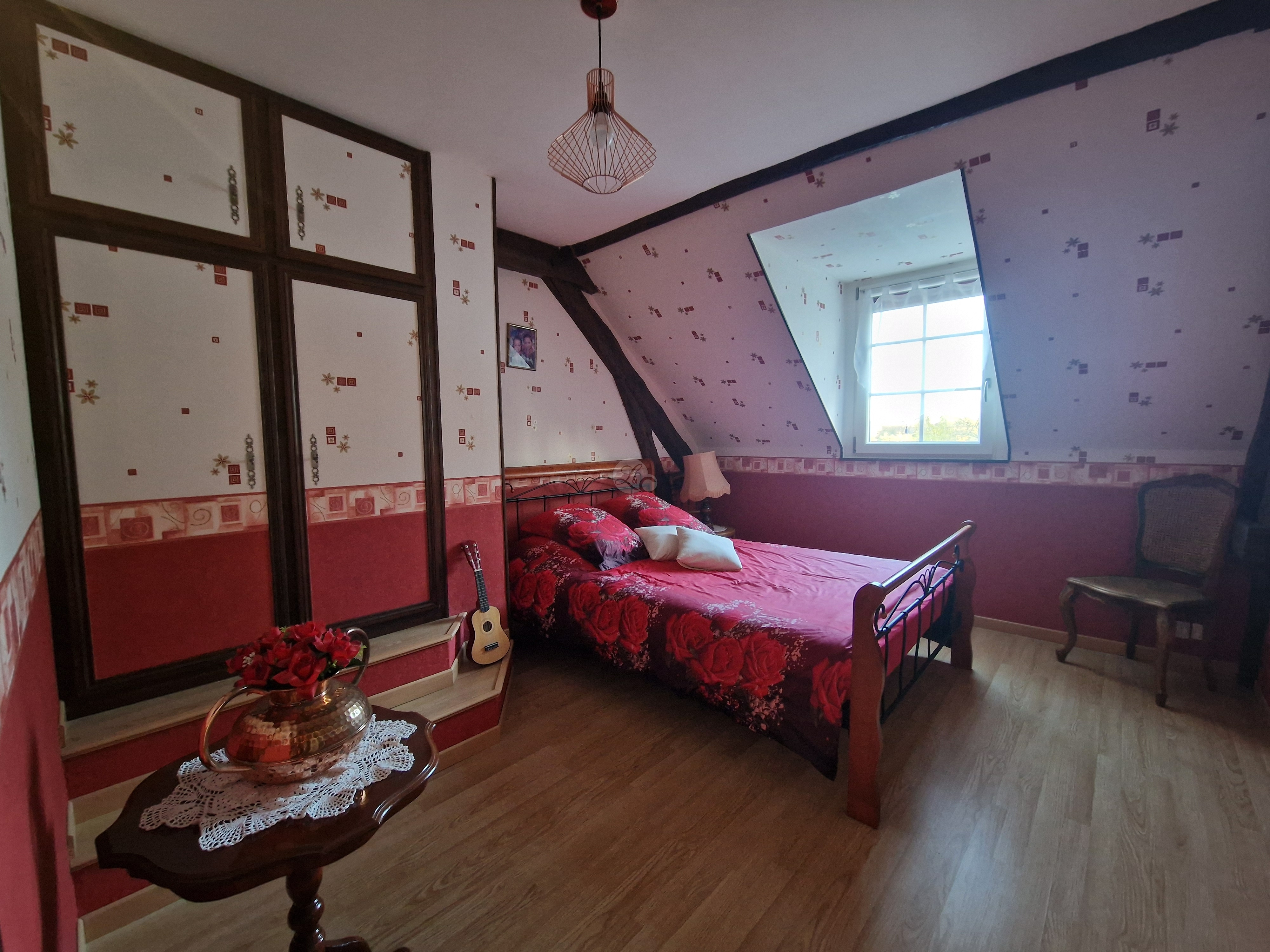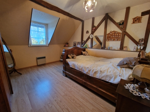 À l’étage, un couloir dessert une salle de bains prolongée par une petite terrasse donnant une vue dégagée sur la campagne environnante. Un second WC, un débarras permettant l’accès aux combles, ainsi que trois chambres composent le reste de l'étage.