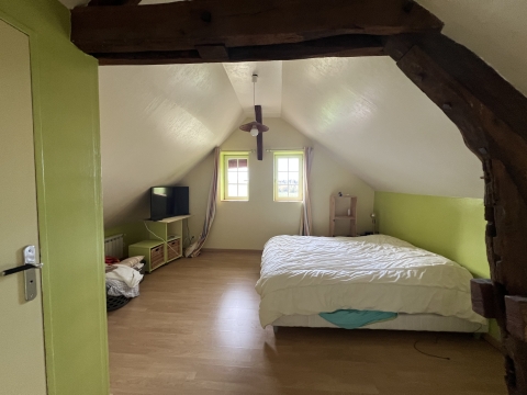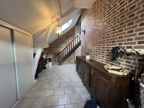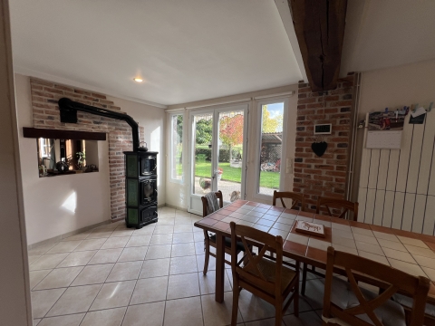 En rez-de-chaussée, sa vaste entrée mène à un séjour lumineux doté d'une cheminée à insert, ainsi qu'à une grande cuisine aménagée et équipée, animée par un poêle à bois. Une chambre, une salle de bains avec baignoire et douche, une buanderie et un cellier complètent ce niveau. L'étage, entièrement climatisé, dispose d'un palier desservant trois chambres, une salle de bains et un WC.