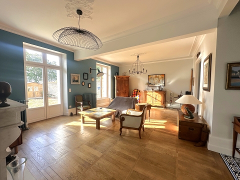 Dès l’entrée, on découvre un salon-séjour agrémenté de boiseries et d’une cheminée, prolongé par une salle à manger ouverte sur la terrasse, ainsi qu’une cuisine équipée disposant également d’un accès vers l’extérieur.