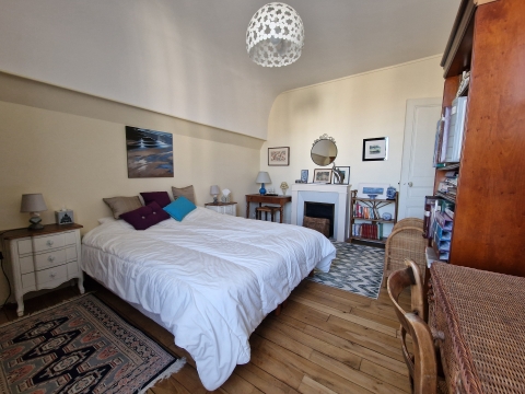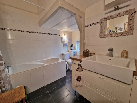 Derrière sa façade particulièrement remarquable, elle dévoile des espaces de vie fonctionnels et soigneusement agencés. Le rez-de-chaussée propose une entrée accueillante, une vaste cuisine aménagée et équipée ouverte sur un séjour où la lumière naturelle s'invite généreusement tout au long de la journée, une chambre avec sa salle d'eau privative récemment aménagée, ainsi qu'une salle de bains complémentaires.