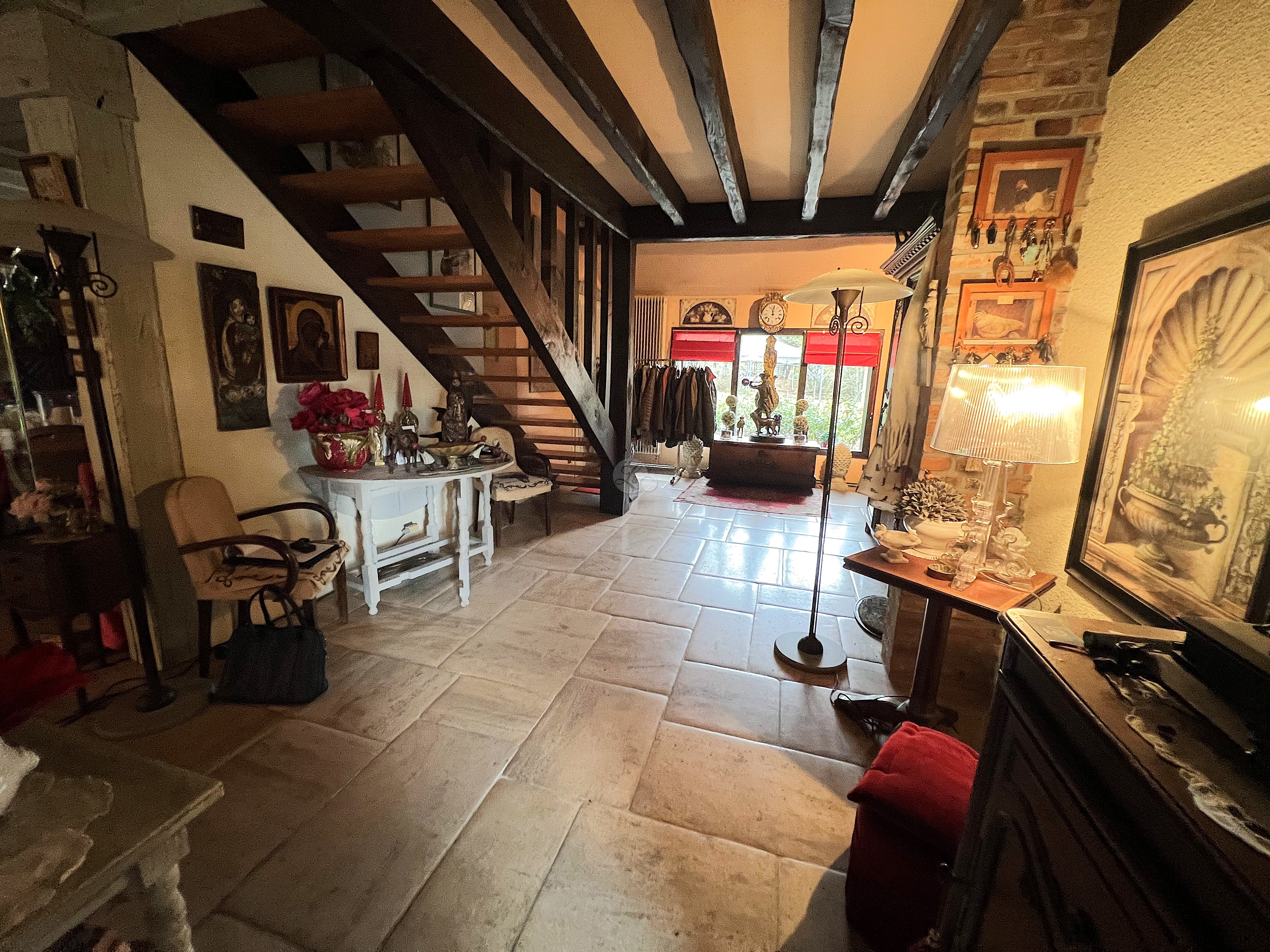 Sur la droite, un couloir mène à un chaleureux salon avec cheminée, une cuisine d'été, une chambre avec salle d'eau attenante, une seconde salle d'eau aménagée dans l'ancien four à pain, un WC, ainsi qu'un accès à l'étage.