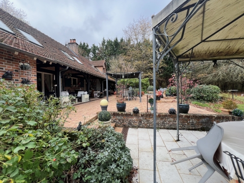 Cette grande longère ouvre sur le parc sur une vaste terrasse, en partie couverte par un auvent, invite à profiter pleinement de la vue sur le parc, véritable havre de tranquillité.