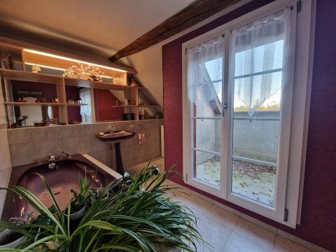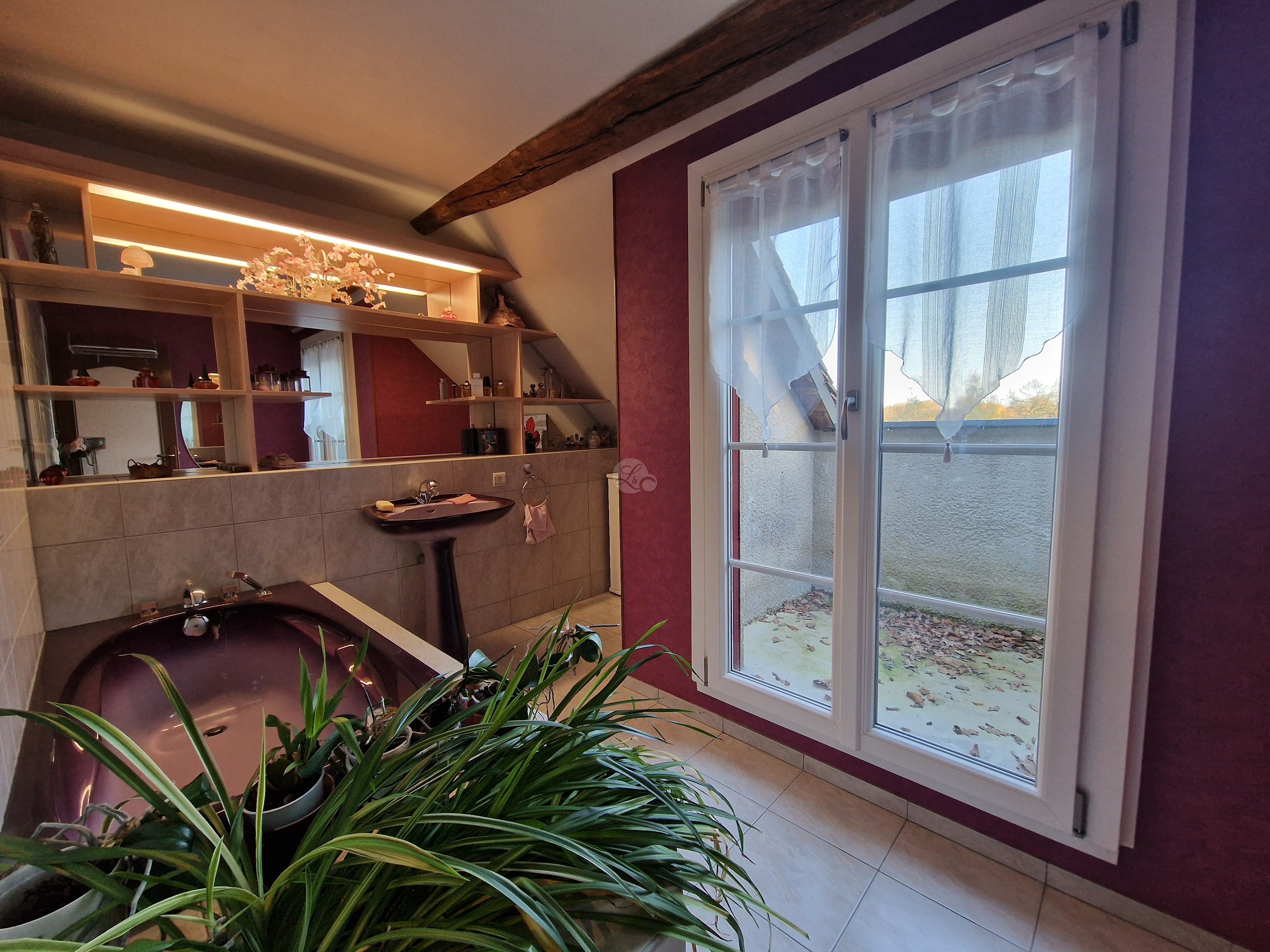 À l’étage, un couloir dessert une salle de bains prolongée par une petite terrasse donnant une vue dégagée sur la campagne environnante. Un second WC, un débarras permettant l’accès aux combles, ainsi que trois chambres composent le reste de l'étage.