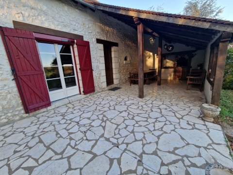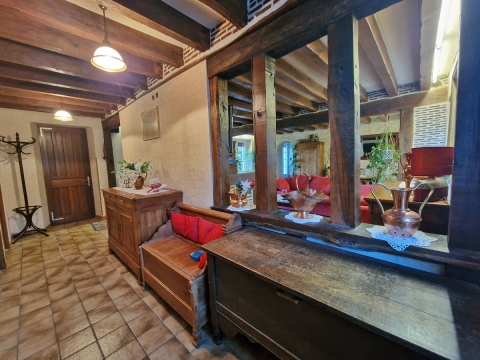 Au rez-de-chaussée, une cuisine aménagée et équipée ouvre directement sur une terrasse orientée sud-est. Le séjour, mis en valeur par ses poutres et pierres apparentes, bénéficie également d’un accès à l’extérieur. S’ajoutent des WC ainsi qu’une salle d’eau.