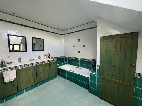 En rez-de-chaussée, sa vaste entrée mène à un séjour lumineux doté d'une cheminée à insert, ainsi qu'à une grande cuisine aménagée et équipée, animée par un poêle à bois. Une chambre, une salle de bains avec baignoire et douche, une buanderie et un cellier complètent ce niveau. L'étage, entièrement climatisé, dispose d'un palier desservant trois chambres, une salle de bains et un WC.