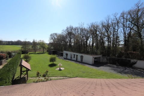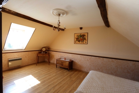 À l’étage, un couloir dessert une salle de bains prolongée par une petite terrasse donnant une vue dégagée sur la campagne environnante. Un second WC, un débarras permettant l’accès aux combles, ainsi que trois chambres composent le reste de l'étage.