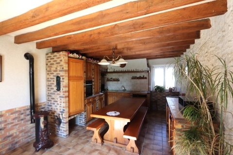 Au rez-de-chaussée, une cuisine aménagée et équipée ouvre directement sur une terrasse orientée sud-est. Le séjour, mis en valeur par ses poutres et pierres apparentes, bénéficie également d’un accès à l’extérieur. S’ajoutent des WC ainsi qu’une salle d’eau.