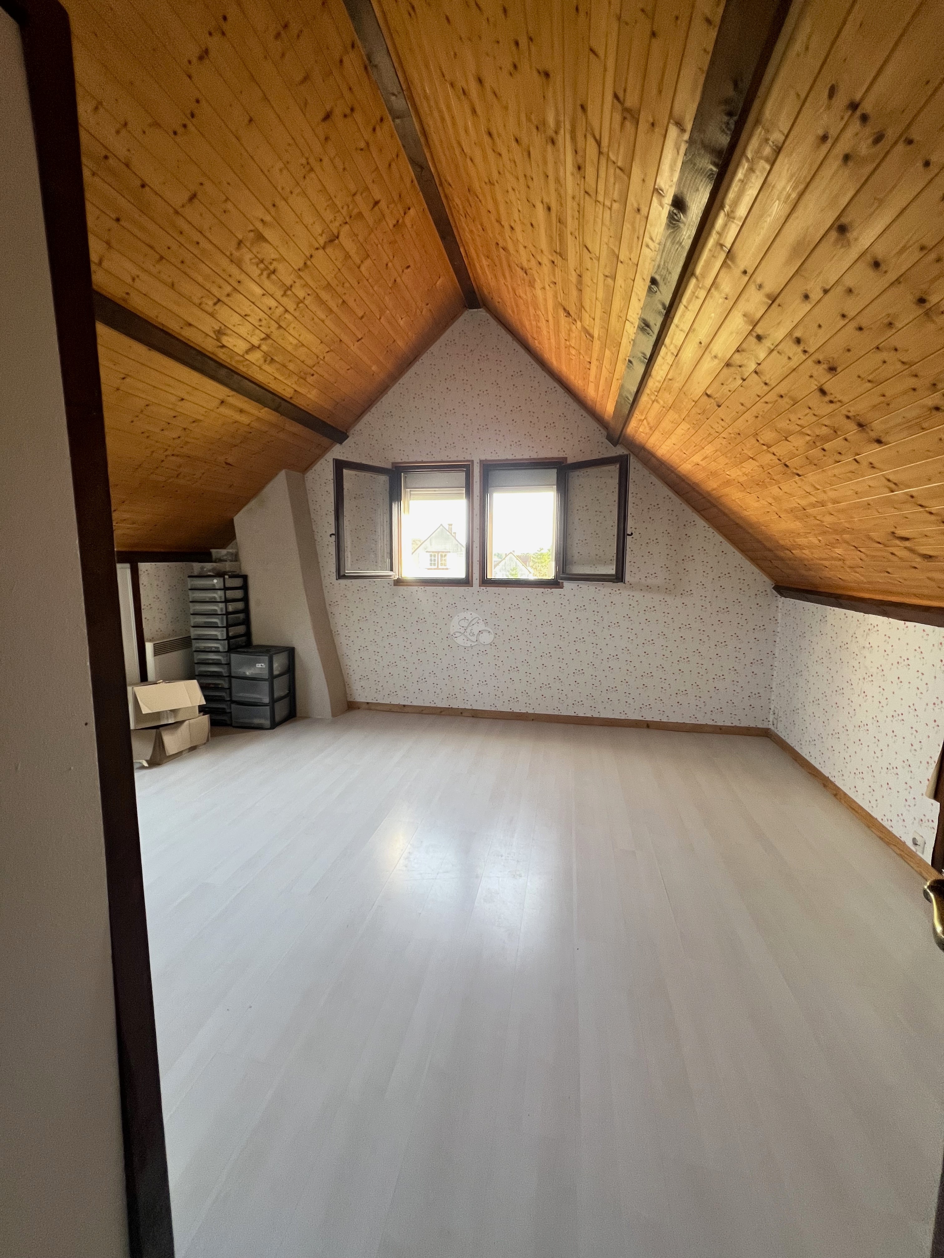 À l’étage, deux chambres indépendantes viennent compléter l’espace nuit. Un grenier aménageable offre également un potentiel d’agrandissement intéressant, permettant d’envisager différents projets selon les besoins : création d’une chambre supplémentaire, d’un bureau ou encore d’un espace dédié aux loisirs.