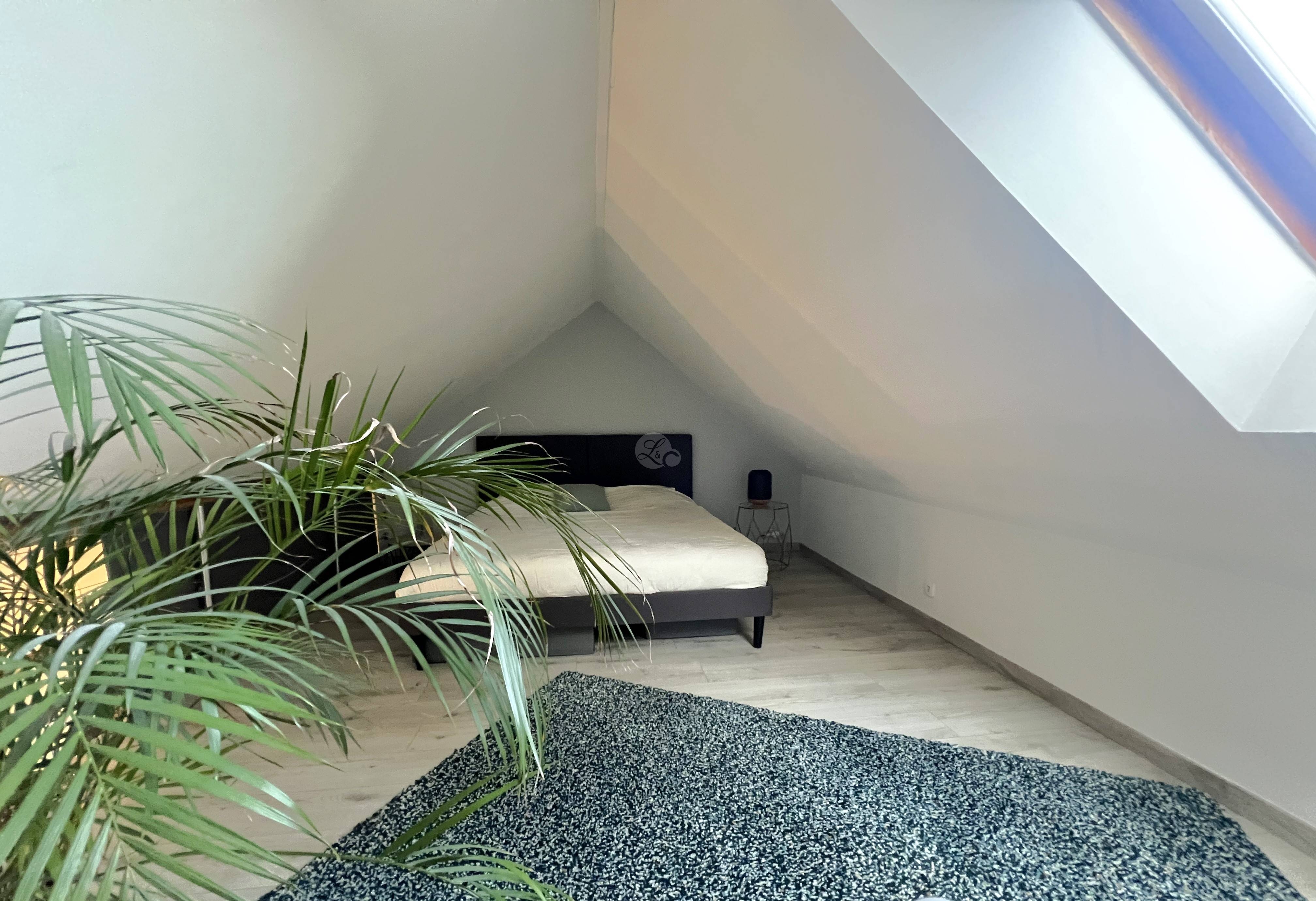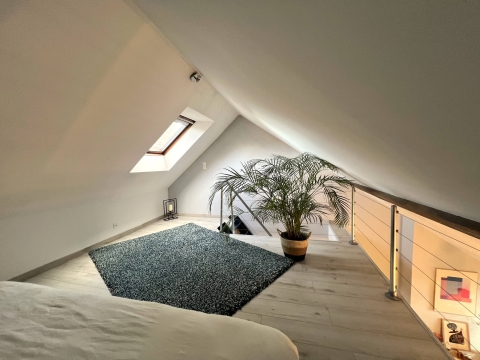 À l’étage supérieur, la mezzanine, aménagée en chambre, apporte un véritable supplément à cet appartement. Sous les toits, elle offre un espace idéal pour un coin nuit plein de charme.
