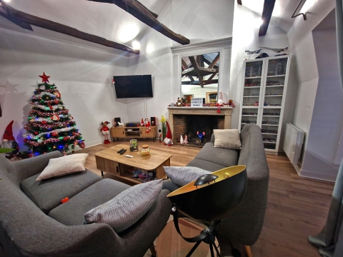 L’entrée dessert un séjour lumineux avec cheminée et poutres apparentes, une cuisine indépendante, ainsi que deux chambres, dont l’une dispose de sa cheminée et l’autre d’une salle d’eau attenante. Un cellier complète ce niveau de manière fonctionnelle.