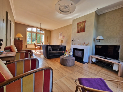 Séjour salon avec parquet ancien, accès terrasse arrière, cheminée ouverte, 33m² env