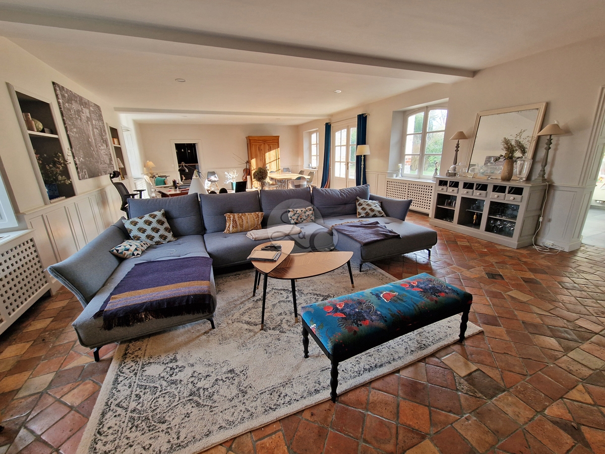 Dès l’entrée, une vaste pièce d’accueil d’environ 35m² donne le ton et mène à une superbe pièce de vie de 85m² baignée d'une lumière traversante et disposant d'une imposante cheminée idéale pour des moments de repos ou de convivialité. La cuisine aménagée et équipée, ouverte sur le jardin grâce à une large baie vitrée, est prolongée d’une vaste lingerie, idéale comme espace fonctionnel et pratique au quotidien.