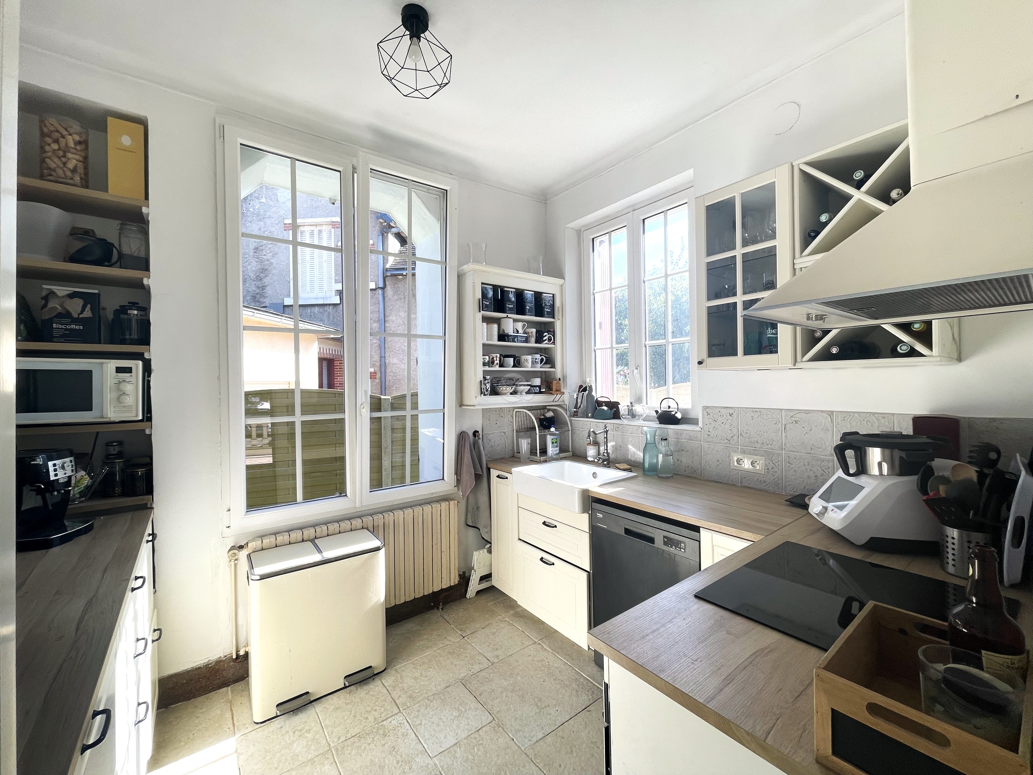 L'entrée en carreaux de ciment dessert un agréable séjour avec bow-window pourvu d'une belle hauteur de plafond. La cuisine dotée d'un passe-plat sur le séjour est aménagée et équipée et offre de nombreux rangements ainsi qu'un plan de travail confortable.