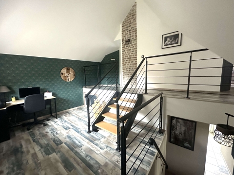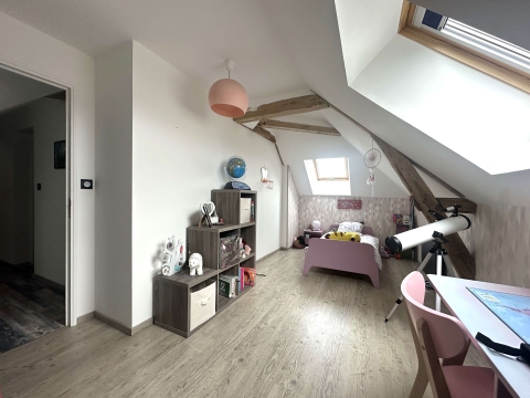 À l’étage, un palier en demi-niveau dessert trois chambres supplémentaires, un WC, une salle d’eau, ainsi qu’une salle de jeux traversante menant à une dernière chambre, offrant de beaux volumes et de multiples possibilités d’aménagement.