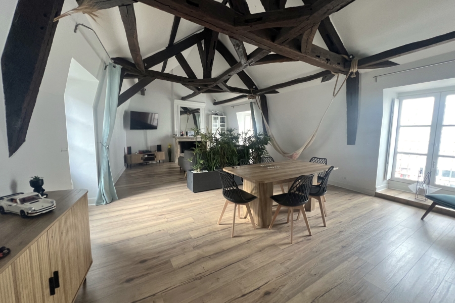 Au cœur du centre-ville de Blois, dans un immeuble de caractère datant des années 1750, ce duplex occupe le premier et dernier étage d’une petite copropriété.